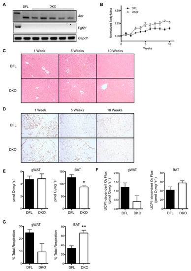 To verify the role of FGF21 in mediating the effects of hepatic AHR deficiency on white adipose tissue morphology and gWAT/BAT respiratory capacity, we generated an inducible, double-conditional AHR-FGF21 knockout (DKO) mouse in which tamoxifen treatment results in simultaneous excision of exon 2 from Ahr, and exons 1–3 from Fgf21. Figure 5A demonstrates the successful and persistent deletion of Ahr and Fgf21 transcripts in individual mice at 10 weeks post-tamoxifen administration. DKO mice maintained on standard rodent chow exhibit significantly faster weight gain than Ahrfl/flFgf21fl/fl (DFL) control mice (DFL slope: 0.016 ± 0.002 week−1, DKO slope: 0.030 ± 0.003 week−1, p < 0.0001) during a 10-week time course (Figure 5B). Consistent with previous data, DFL and DKO mice displayed comparable liver morphology at 1, 5, and 10 weeks post-tamoxifen treatment (Figure 5C). Immunohistochemical staining for UCP1 in gWAT at these time points demonstrates minimal staining in both DFL and DKO mice (Figure 5D). We also observed no visible differences in adipose tissue morphology between the two strains throughout the 10-week period. After five weeks post-AHR loss, total respiratory capacity in gWAT from DFL and DKO mice was near equivalent, while BAT respiratory capacity was reduced by a significant 30% in DKO mice (Figure 5E). Figure 5F shows that absolute UCP1-dependent respiration was modestly decreased in gWAT from DKO mice, and slightly increased in BAT relative to DFL; however, the differences fall short of statistical significance. When calculated as a percentage of total respiratory capacity, UCP1-dependent respiration appears to contribute modestly less to total respiration in DKO mice (p = 0.07) (Figure 5G). In contrast, the contribution of UCP1-dependent respiration to total BAT respiration was significantly increased two-fold in DKO mice relative to DFL.