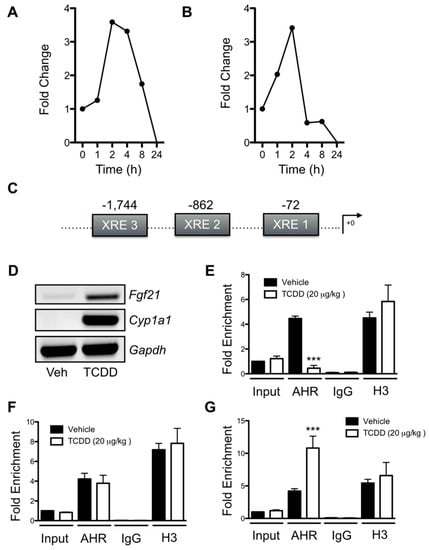 Transient AHR agonist induction of Fgf21 transcription correlates with distinct binding events at the Fgf21 promoter. (A) 6 nM 2,3,7,8-tetrachlorodibenzo-p-dioxin (TCDD) and (B) 30 μM cinnabarinic acid transiently induce Fgf21 transcription in Ahrfl/fl primary hepatocytes at 2 h, with gene expression subsiding by 24 h. (C) Schematic indicating the locations of XRE1, XRE2, and XRE3, within the Fgf21 promoter. (D) Exposure of female Ahrfl/fl mice (n = 3) to 20 μg/kg TCDD induces hepatic Cyp1a1 and Fgf21 transcription at 2 h, and is associated with (E) reduced AHR binding at XRE3. (F) AHR exhibits constitutive, agonist-independent binding at XRE2. (G) TCDD exposure in Ahrfl/fl females increases AHR binding to XRE1 at 2 h. Gene expression is calculated as fold-change from time point zero. Chromatin immunoprecipitation (ChIP) data are calculated as fold enrichment from vehicle input and presented as mean ± SEM. All experiments were performed in triplicate. Statistical analysis was performed using a Student’s t test, with significant differences relative to vehicle denoted as *** p < 0.001.