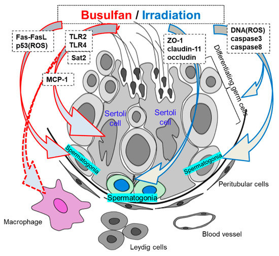 Busulfan treatment has been shown to disrupt spermatogenesis by damaging germ cells and Sertoli cells [42,43]. Although busulfan has been extensively studied regarding to induction of testicular damage through various cellular and molecular mechanisms, the effects of treatment on testicular immunology have not been thoroughly evaluated (Table 1). Choi et al. showed that busulfan may induce germ cell apoptosis through loss of c-kit signaling in a Fas/FasL- and p53-independent manner in 8–12-week-old mice [44]. Moreover, using the same adult mice, Li et al. demonstrated that p53 is a key protein with roles in busulfan-induced apoptosis through reactive oxygen species (ROS)-dependent activation of the extracellular signal-regulated kinase/p38 pathway, and decreased concentrations of deacetylated p53 result in spermatogonial cell resistance to apoptosis [45]. Xian et al. showed that spermidine/spermine N1-acetyltransferase 2 (Sat2) is present in adult mice testicular Sertoli cells and that its expression is significantly increased by busulfan treatment. Furthermore, upregulation of Sat2 by busulfan alters the growth and function of Sertoli cells and causes male infertility [46]. Zhang et al. demonstrated that busulfan-induced spermatogenic cell damage upregulates tumor necrosis factor (TNF) α and macrophage chemotactic protein (MCP) 1 expression in Sertoli cells and facilitates macrophage infiltration into the testes of 8–10 weeks age mice [47]. Additionally, damaged germ cells in busulfan-treated mice release endogenous Toll-like receptor (TLR) ligands to activate TLR2 and TLR4 in Sertoli cells, thus initiating endogenous inflammation in the testes [47,48]. Activation of TLRs induces inflammatory gene expression, which may facilitate injury repair and lead to further pathological conditions, such as autoimmune diseases [49,50,51].