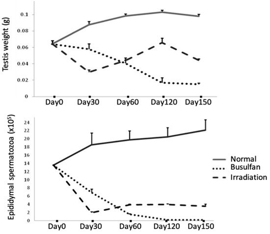 Sinisi et al. investigated the occurrence of antisperm antibody (ASA) in 264 prepubertal male boys (ages 1.2–13 years) treated with chemotherapy and confirmed that 26 of these patients were ASA-positive [52]. Moreover, of the 26 ASA-positive boys, 24 had genital tract abnormalities, such as cryptorchidism, testicular torsion, and hypospadias, and two had leukemia with testicular infiltration [52]. Therefore, these findings suggested that chemotherapy did not modify antibody positivity. Only one experiment showed that remaining spermatogonia after 40 mg busulfan-treatment reacted strongly to IgG antibodies and that serum IgG levels increased in a manner corresponding with the increase in testicular IgG levels in adult (8–12-week-old) ICR mice [53]. Researchers demonstrated that serum IgG increased from 4 weeks after busulfan treatment, peaked at 7 weeks, and dropped rapidly to control concentrations after 8 weeks. In contrast, the testicular levels of IgG showed a gradual increase that accelerated after 3 weeks and peaked at 6 weeks, before dropping to control serum levels at 8 weeks. In our previous busulfan study in 4-week-old C57BL/6 mice, we examined serum anti-germ cell antibodies in 40 mg busulfan-treated mice and demonstrated that no anti-germ cell antibody production could be detected at 60 days after busulfan treatment (according to immunohistochemistry using serum samples and anti-mouse IgG) [48]. Moreover, we demonstrated that busulfan treatment progressively decreased the weight of the testes and the epididymal sperm count from day 60 to 120 and that 40 mg busulfan-induced aspermatogenesis was irreversible for at least 360 days [48,54,55]. We surmised that the primary cause of this aspermatogenesis involved factors other than ASA. We also showed that normalized macrophage migration and reduced expression of TLR2 and TLR4 after busulfan treatment could completely rescue the injured seminiferous epithelium and alleviate aspermatogenesis [48]. These differences may be related to the different experimental periods because it is well known that the infertility after busulfan is in a time- and dose-dependent manner, and is also possibly related with different species or ages of mice.