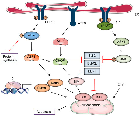 Briefly, ER stress results in the sequential activation of three ER stress sensor receptors viz. protein kinase RNA-like endoplasmic reticulum kinase (PERK), activating transcription factor 6 (ATF6) and inositol-requiring enzyme 1 (IRE1). Activated PERK attenuates general protein synthesis via phosphorylative inactivation of eukaryotic initiation factor 2α (eIF2α), which also results in the recruitment of activating transcription 4 (ATF4) [41]. ATF4, in turn, promotes activation of the pro-apoptotic, Bcl-2 family protein, Noxa, and the transcription factor, C/EBP-homologous protein (CHOP), which is also activated by ATF6. These events converge on BAX and BAK to initiate the mitochondrial pathway of apoptosis, which is potentiated by the activation of IRE1-driven sequential activation of apoptosis signal-regulating kinase 1 (ASK1) and c-Jun N-terminal kinase 1 (JNK), resulting in the inactivation of the anti-apoptotic proteins Bcl-2, Bcl-XL, and Mcl-1 [41]. These mechanisms are depicted in Figure 2, reproduced with permission from Iurlaro et al. [41].