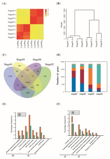 To determine whether this gene expression correlated with developmental stages, reads numbers were firstly normalized to RPKM value, and then were subjected to the usual correlation coefficient (R2) and hierarchical clustering analysis []. We found that two biological replicates of all samples showed consistent determinations of transcript abundance with a coefficient (R2) greater than 0.93 (Figure 1A). In addition, gene expression correlations between different stages were compared. Results found that the coefficients of 3 DPA (stage01) and 8 DPA (stage02) were 0.73 (R2 > 0.73) and those of 13 DPA (stage03) and 18 DPA (stage04) were higher with the value of 0.89. However, the coefficient between 13 DPA (stage03) and 8 DPA (stage02) was only 0.10, indicating a large change in gene expression pattern occurred during the process. It may be the transition from prestorage phase to storage phase, which was consistent with a previous study finding that the most dramatic transcriptional and physiological changes occurred during transition from the prestorage to the storage phase []. Similar stage expression patterns were supported by correlation dendrogram analysis (Figure 1B). The correlation dendrogram demonstrated that the four stages were clearly clustered into two groups, namely 3 DPA (stage01) and 8 DPA (stage02) grouped together, and 13 DPA (Stage03) and 18 DPA (Stage04) clustered into another group. Then, we also used the publicly available barley grain RNA-seq data (5 DPA and 15 DPA) to perform correlation analysis. Results found that 3 DPA and 8 DPA showed high correlation coefficient with 5 DPA and 13 DPA and 18 DPA showed high correlation coefficient with 15 DPA, which also could be clustered into two groups (Figure S3). Overall, the correlation analyses results were in agreement with the developmental order as expected, which were consistent with the previous study [].