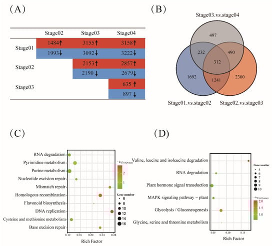 Differential expression genes during barley grain development. (A) Number of genes showing up- or downregulated expression during barley grain development (Padj < 0.05 and |log2Ratio| ≥1). (B) Venn diagram analyses of genes that were differentially expressed between any two consecutive stages in barley. (C) KEGG enrichment analysis of DEGs in cluster V during barley grain development. (D) KEGG enrichment analysis of DEGs in cluster VII.