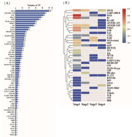 Characterization of transcription factors (TFs) differentially expressed during barley grain development. (A) Number of transcription factors (TFs) differentially expressed between any two stages of barley grain development. (B) Characterization of TF in each expression pattern.