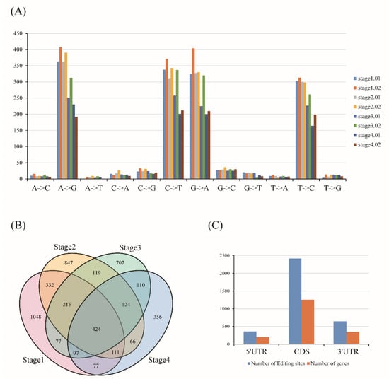 Identification of the RNA editing events during barley grain development. (A) The frequency of different types of nucleotide editing at four stages of barley grain development. (B) Venn diagram analysis of the abundance of RNA editing events among four stages of barley grain development. (C) The localization of RNA editing events in genic regions.