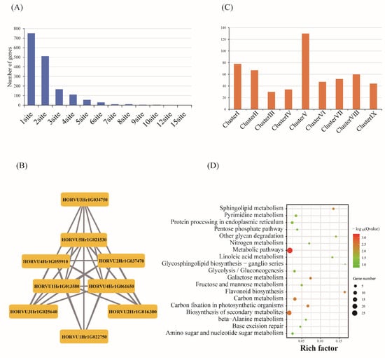 RNA editing is an important post-transcription mechanism to enrich genetic information and regulate diverse biological processes. After filtering the lower coverage sites as described in Method section, a total of 4711 editing sites were identified during the barley grain development, with 12 base change types, of which four editing types (A->G; C->T; G->A; T->C) were significantly higher than the other eight types (Figure 4A, Table S8). This result showed the transition occurred more abundantly than transversion in RNA editing, which was consistent with previous studies []. Then, the stage-specific and overlapped editing sites of these four stages were investigated. Results showed that stage01 owned the highest unique sites, with the number of 1048, followed by stage02, stage03, and stage04, with the numbers of 847, 707, and 356, respectively (Figure 4B). Among these editing events, a total of 3410 sites were found in 1795 protein-coding genes (Table S8), of which 2412 were found in CDS region, and 356 and 642 sites were located in 5′ and 3′ UTR regions (Figure 4C), respectively, suggesting that most editing could change the genetic information to result in the change of the encoded protein sequence. The gene HORVU7Hr1G000580 showed the most abundant editing sites with the total value of 15, and most of the other genes were observed to have one editing site (Figure 5A). Totally, 783 editing sites in 542 genes were observed to result in the amino acid change, of which 139 editing events (25.65%) led to a conversion from hydrophilic amino acid to hydrophobic amino acid, and 102 (18.82%) changing from hydrophobic amino acid to hydrophilic amino acid (Figure S6). A series of genes related to starch and sugar metabolic processes were found to be edited, such as beta-amylase 5 (HORVU4Hr1G089510), fructose-1,6-bisphosphatase class 1 (HORVU4Hr1G060630, HORVU1Hr1G074330) and low-molecular-weight glutenin subunit (HORVU1Hr1G001350, HORVU1Hr1G001420, HORVU1Hr1G001120, HORVU1Hr1G001120, HORVU1Hr1G000930, HORVU1Hr1G000930, HORVU1Hr1G001080) (Table S9). What is more, 4 terminators were found to be converted to 1 hydrophobic and 3 hydrophilic amino acids, and 1 hydrophobic and 11 hydrophilic amino acids were converted to terminators due to RNA editing. The embryo-defective related gene (HORVU2Hr1G037470) had 4 C to T editing events occur during barley grain development, and two of them caused the amino acid change (H>Y, A>V), one site with no amino acid change (C>C), and one resulted in the termination of the coding transformation (Q>*) (Figure S7). The stop code of this gene caused by editing may lead to the defect development of the embryo (Figure 5B). Furthermore, combined with the expression patterns, 308 DEGs were found to have RNA editing occur and the edited genes were more abundant in cluster I, cluster II, and cluster V, compared to cluster III, cluster IV, and cluster VII (Figure 5C). Then, KEGG analysis of them showed that they were enriched in metabolic pathways, biosynthesis of secondary metabolites, carbon fixation in photosynthetic organisms, carbon metabolism, base excision repair, pentose phosphate pathway, and glycolysis/gluconeogenesis (Figure 5D). These results demonstrated that RNA editing may function as the crucial regulator to control the complex process of barley grain development.