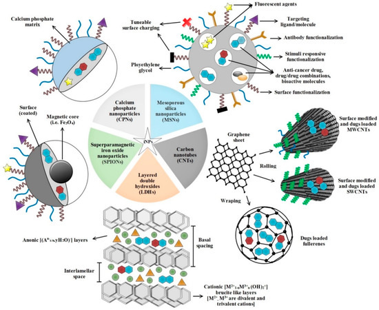 Known as anionic clays, LDHs (Figure 1) have attracted huge attention of researchers owing to their great potential to be used as anti-cancer NDDPs. They are low cost and have ease of preparation, high drug loading efficacy, full protection for loaded drugs, considerable drug delivery, biocompatibility, anion exchange capability, pH-responsive drug release, efficient cell membrane penetration, good endosomal escape, biodegradation in the cellular cytoplasm (pH between 4 and 6) and above all, the drug release rate can be tuned by changing the interlayer anion [65,66,67]. In addition, the internal/external surfaces of LDHs can easily be functionalized and modified to incorporate the targeting function, and their high specific surface area and better chemical stability make them attractive substances for diverse biomedical applications. Structurally, LDHs are layers of divalent metal ion (i.e., Mg2+, Ca2+, Ni2+, Zn2+) with a trivalent metal ion isomorphically substituted to give the layers a net positive charge [67]. Th charge is balanced by interlayer hydrated anions, resulting in a multilayer of alternating host layers with exchangeable gallery anions (i.e., Cl−, NO3−, CO32−).