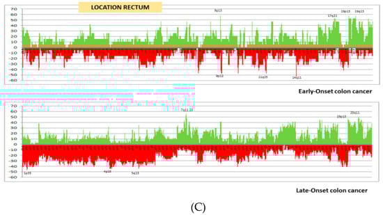 Differences within rectal cancers are more prominent in the early-onset subset: later-stages at diagnosis, less association with polyps, and more than half of them associated with a familial LS component, although all of them are MSS. Only the CIMP-High-MSS category (36%) within LORC is noteworthy. Only a few differential chromosomal segments appeared at high rates, and the most frequent were associated with LORC; one of these, gains in 5q13.2, involves a segment associated with rectal metastatic carcinomas [].
