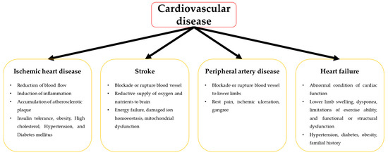 CVD is a circulatory systemic disease caused by abnormal heart and blood vessel condition. CVD includes ischemic heart disease, stroke, peripheral arterial disease, and heart failure (Figure 1).