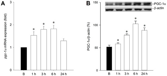 (A) Upregulation of expression of pgc-1α mRNA, and (B) changes in PGC-1α protein relative to β-actin after microinjection of kainic acid (KA) in hippocampal CA3 subfield. Samples were collected from the right CA3 subfield of the hippocampus at 1, 3, 6, or 24 h after microinjection of 0.5 nmol KA or phosphate buffered saline (PBS) into the left hippocampal CA3 subfield. Values are mean ± standard error of the mean (SEM) of quadruplicate analyses from six animals per experimental group. * p < 0.05 versus sham-control group in the Scheffé multiple-range test.