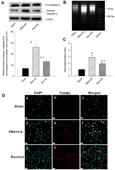 Resveratrol reduced seizure-related neuronal damage in in kainic acid (KA)-induced status epilepticus in hippocampal CA3 subfield. (A) Representative gels (inset) or changes in activated caspase-3 to pro-caspase-3 (normalized with β-actin) detected in the cytosolic fraction of samples collected from the CA3 subfield of hippocampus in animals with sham-controls 7 days after microinjection of KA (0.5 nmol) into the left hippocampal CA3 subfield with PBS or resveratrol (Res, 100 µmol) pretreatment. (B) Qualitative and (C) quantitative analysis of DNA fragmentation detected in samples collected from the CA3 subfield of hippocampus 7 days after induced status epilepticus. Values are mean ± SEM of quadruplicate analyses from six animals per experimental group. * p < 0.05 versus sham control group, + p < 0.05 versus PBS + KA in the Scheffé multiple-range test. (D) Immunofluorescent staining showed terminal deoxynucleotidyl transferase dUTP nick end labeling (TUNEL) immunoreactivity in hippocampal CA3b neurons on the right side, by co-immunofluorescence staining with 4′,6-diamidino-2-phenylindole (DAPI) (arrows), in sham-control animals (a–c), or 7 days after microinjection of KA in animals that received pretreatment with PBS (d–f) or with resveratrol (Res, 100 µmol) (g–i). Scale bar, 10 μm.