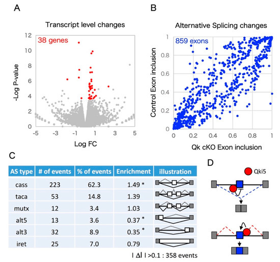 We performed unbiased mRNA-SEQ analysis to detect Qki-dependent transcriptomics in the developing neocortex. Embryonic day 14.5 mouse cortex RNA from two independent Qkfl/fl (control) and Nestin-cre:Qkfl/fl (Qk cKO) littermates was used to prepare mRNA libraries through polyA selection and 150 base pair (bp) paired-end sequencing using the Illumina (San Diego, CA, USA) HiSeq system. Sequence reads were aligned to the mouse genome (mm10) and an exon junction database using OLego, and gene expression levels and alternative splicing events were quantified using Quantas [26]. In total, about 80 million paired-end reads were obtained for the control and Qk cKO mRNA-SEQ samples. Over 10 million clusters included spliced junction reads among uniquely mappable regions (Table 1). Importantly, Exon 2 of Qk mRNA was greatly reduced in Qk cKO, indicating high efficiency of Cre recombination and low contamination of non-neural tissue (Figure 1A). This reduction was also confirmed by a quantitative RT-PCR assay (Figure 1B). We investigated mRNA-SEQ data to determine whether loss of the Qk gene affects steady-state levels of mRNA. In Qk cKO, steady-state levels of 15 transcripts were significantly upregulated, and 43 transcripts were significantly downregulated (EdgeR statistics; p < 0.01, FDR < 0.1) (Figure 2A and Supplemental Table S1). Following the removal of weakly expressed transcripts (RPKM < 1.0 in either control or Qk cKO), we found only 38 transcripts with significant changes (Figure 2A). This suggests the possibility that the nuclear isoform Qki5, which functions in pre-mRNA splicing rather than in regulating expression level, is expressed in embryonic cortices at higher levels than the other isoforms, Qki6 and Qki7, which play roles in steady-state level of mRNA abundance [11,27]. To further determine whether the Qk cKO affects pre-mRNA splicing events in the embryonic neocortex, we next analyzed mRNA-SEQ data at the exon junction level. We discovered 859 mRNA splicing defects, which could be due to changes in Qki-dependent RNA splicing events with significant differences relative to the control (Fisher’s exact test in Quantas: p < 0.01, FDR < 0.1) (Figure 2B). Among the 358 alternative splicing changes that included at least 0.1 of ΔI ratio between control and cKO, all alternative exon types (cassette type, tandem cassette type, mutually exclusive, 5′ASS, 3′ASS, and retained intron) were included. Notably, the cassette-type exon was significantly enriched compared with other types (enrichment score: 1.49) (Figure 2C). In addition, the changes of their cassette type exons are largely consistent with a position dependent alternative splicing mechanism, which we previously defined as evidenced by adding the information of Qki5-HITS-CLIP (high throughput sequencing-cross linking immunoprecipitation) result (Figure 2D, Supplemental Table S2 and [11]).