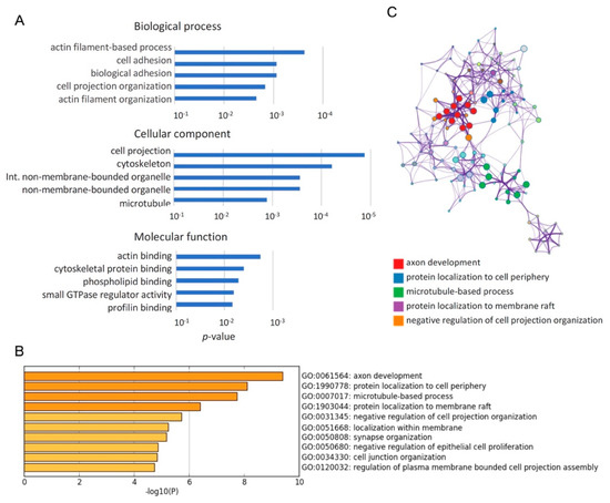To investigate how Qk deficiency affects biological processes in cortical development, we performed a gene ontology (GO) analysis for a list of 251 genes with differentially spliced exons between control and Qk cKO (l ΔI l > 0.1 and RPKM > 1) using DAVID (The Database for Annotation, Visualization and Integrated Discovery) bioinformatics resources (Figure 3A). This comprehensive analysis revealed that cytoskeleton-related GO terms, such as actin filament, cell adhesion, cell projection, and microtubule, are over-represented in the GO terms ranked among the top 5 terms. To further identify the biologically relevant pathways, we performed Metascape analysis using the same list as above. GO terms, such as axon development, protein localization to cell periphery, and microtubule-based process, were identified as statistically enriched ontology clusters among Qki-regulated alternative splicing events (Figure 3B,C and Table 2). Notably, Flna and Nin, both of which have biologically relevant exons related to the NPC-to-neuron transition [16], are repetitively listed in genes of cytoskeleton-related GO terms. These results suggest that Qki5 is an important factor in pre-mRNA splicing during NPC-to-neuron transition in the embryonic neural stem cells.