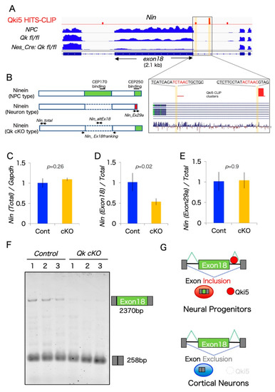 Quaking (Qk) gene generates three major alternative spliced mRNAs encodes three RNA-binding protein isoforms, Qki5, Qki6, and Qki7, which differ only in C-terminal regions [22]. In our previous study, we proposed Qki5 as a novel neural stem cell regulator in the developing neocortex, as evidenced by its highly specific expression in neural stem cells relative to Qki6 and 7 [11]. Qki5 governs alternative splicing events through three modes of pre-mRNA splicing regulation, as predicted by transcriptome analysis and HITS-CLIP, a method that map the protein-RNA interaction at the transcriptome-wide [23,24,25] and suppresses neuronal transcript levels in primary neural stem cell culture [11]. Although this evidence suggests that Qki5 is associated with NPC-to-neuron transition via pre-mRNA splicing, the splicing dynamics and specific targets of Qki5 in the developing neocortex remain unclear. In the present study, we performed mRNA-SEQ analysis using mRNAs obtained from the cortex of Qk conditional knockout (cKO) mice to examine Qki5-dependent RNA splicing dynamics as they relate to the NPC-to-neuron transition. We found several Qki5-dependent alternative splicing changes, including a very large exon18 of the Nin gene, which is strongly associated with the NPC-to-neuron transition.