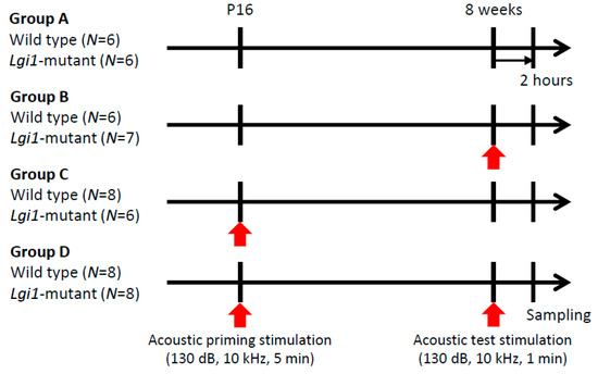 Wild-type (WT) rats and Lgi1 mutant rats were divided into four groups. Groups A and B did not receive the acoustic priming stimulation without (Group A) and with (Group B) the test stimulation (130 dB, 10 kHz, one minute) at the age of eight weeks, respectively (Figure 1). Groups C and D received the acoustic priming stimulation (130 dB, 10 kHz, five minutes) at postnatal day (P) 16 without (Group C) and with (Group D) the test stimulation at eight weeks, respectively.