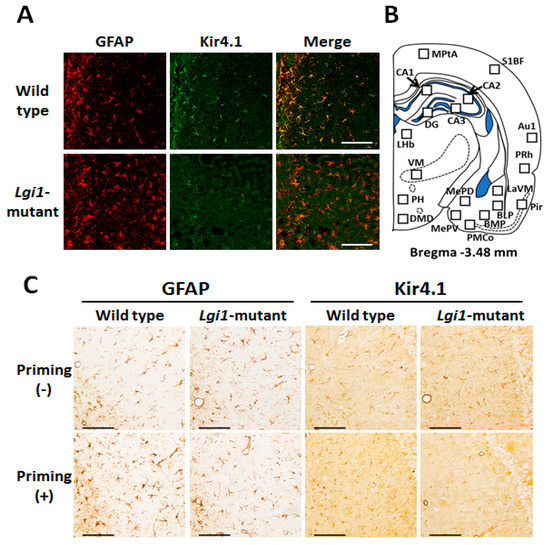 We first confirmed the expression pattern of Kir4.1 in WT F344 rats using the immunofluorescent double-staining techniques. As in other strains (Wistar and SD rats) [14,20,29], Kir4.1-immunoreactivity (IR) was mostly co-stained with glial fibrillary acidic protein (GFAP), which is a specific marker for astrocytes, in stellate-shaped cells (Figure 2A top), illustrating that Kir4.1 channels are specifically expressed in astrocytes in F344 rats. In addition, Kir4.1 expression in astrocytes was considerably reduced in the Lgi1 mutant rats that received priming stimulation at P16 (Figure 2A bottom).
