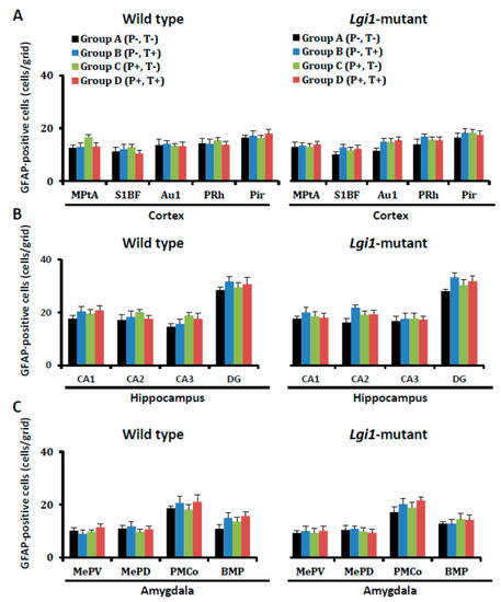 Neither priming stimulation at P16 nor test stimulation at eight weeks affected the number of astrocytes (GFAP-IR-positive cells) per se either in WT or Lgi1 mutant rats of groups A–D (Figure 3).