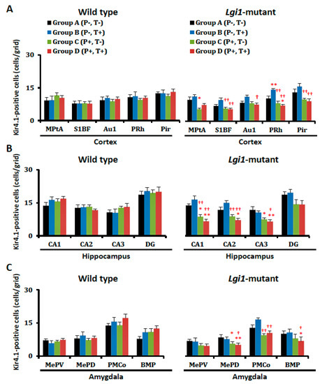 Changes in the number of Kir4.1-immunoreactivity (IR)-positive cells after development of audiogenic epilepsy. Kir4.1-IR-positive cells in each group of wild-type rats (A–D) and Lgi1 mutant rats are shown in each region of the cortex (A), hippocampus (B), and amygdala (C). Each point represents the mean ± S.E.M. of six to eight animals. * p < 0.05, ** p < 0.01, significantly different from Group A of wild-type rats and Lgi1 mutant rats. † p < 0.05, †† p < 0.01, significantly different from Group B of wild-type rats and Lgi1 mutant rats.