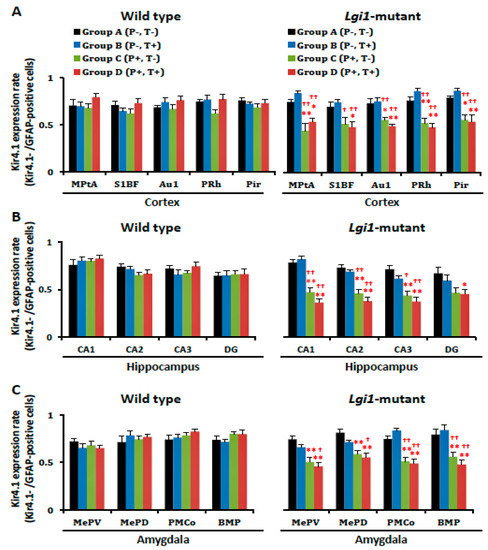 However, the number of Kir4.1-IR-positive cells was markedly reduced by the priming stimulation in Lgi1 mutant rats (Group C) (Figure 2C and Figure 4). The Kir4.1 expression rate (ratio of Kir4.1-IR-positive cells versus GFAP-IR-positive cells) in the primed Lgi1 mutant rats was also significantly decreased by the priming stimulation in the cerebral cortex (Medial parietal association cortex, MPtA; primary auditory cortex, Au1; perirhinal cortex, PRh; and piriform cortex, Pir), hippocampus (CA1, CA2, and CA3), and amygdala (medial amygdaloid nucleus posteroventral part, MePV; medial amygdaloid nucleus posterodorsal part, MePD; posteromedial cortical amygdaloid nucleus, PMCo; and basomedial amygdaloid nucleus posterior part, BMP) (Figure 5). These changes in Kir4.1 expression seemed to be time-dependent, since there was no acute change in Kir4.1 expression in Lgi1 mutant rats at one day after priming stimulation (P17) (Supplementary Figure S1). Although adiogenic seizures induced by the test stimulation tended to further reduce Kir4.1 expression in some brain regions (e.g., cerebral cortex, hippocampus, and amygdala) of the Lgi1 mutant rats, these changes between Group C and Group D were not statistically significant (Figure 4 and Figure 5). We also checked the changes in Kir4.1 expression by three-way (i. mutation; ii. priming stimulation; iii. test stimulation) ANOVA, which revealed a statistical significance with the two factors, mutation and priming stimulation, but not with the test stimulation, in most brain regions.