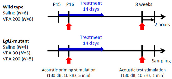 To determine whether an antiepileptic agent modified the pathophysiological alterations in Kir4.1 channels in Lgi1-related epileptogenesis, we studied the prophylactic actions of VPA in Lgi1 mutant rats, with a focus on its regulation of Kir4.1 channel expression. From one day before priming stimulation, animals were intraperitoneally injected with VPA (30 mg/kg and 200 mg/kg) (Sigma-Aldrich) or saline for 14 continuous days (Figure 6). Then, the animals were subjected to the audiogenic seizure test four weeks after the last VPA treatment, and brain samples were obtained as described previously.