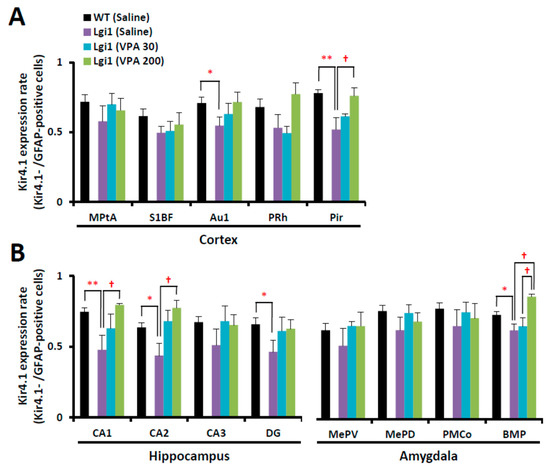 Expression changes in astrocytic Kir4.1 with treatment of valproic acid (VPA). Kir4.1 expression ratios of wild-type rats treated with saline and Lgi1 mutant rats treated with saline or VPA (30 mg/kg or 200 mg/kg) are shown in each region of the cortex (A), hippocampus, and amygdala (B). The Kir4.1 expression rate was expressed as the ratio of Kir4.1-IR-positive cells to GFAP-IR-positive cells in each region. Each point represents the mean ± S.E.M. of four to six animals. * p < 0.05, ** p < 0.01, significantly different from wild-type rats treated with saline. † p < 0.05, significantly different from Lgi1 mutant rats treated with saline.
