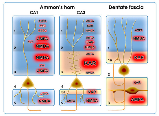 - The reactive plasticity of the iGluRs in different hippocampal regions accommodates to neuronal types (principal neurons/interneurons) and afferent connections (Figure 3). The inhibitory interneurons of the hippocampus utilize KARs, NMDARs, and Ca2+-permeable AMPA receptors, and these iGluR combinations may be responsible for the ongoing degeneration of hippocampal inhibitory interneuron populations in epilepsy [98].