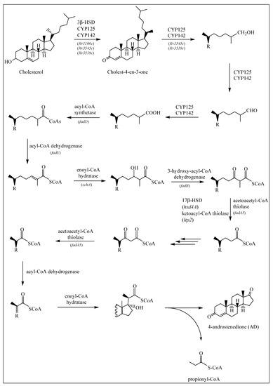 Based on the available literature [19,22,23,24,25,26,27], the cholesterol catabolic pathway in M. tuberculosis can be divided into two major phases—the initial degradation of the aliphatic side chain (Figure 1) and the subsequent degradation of the four alicyclic A–D rings (Figure 2 and Figure 3). It has not been confirmed whether there is a specific order to the degradation reactions regarding the side chain and rings, but for M. tuberculosis it has been suggested that the ring-degrading enzymes KsaAB and HsaA-C act optimally after the side chain has been removed, since blockage of the side chain degradation resulted in accumulation of cholest-4-en-3-one as a major metabolite [19].