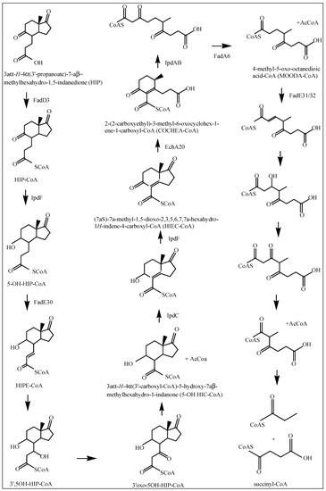 Proposed catabolic pathway of HIP [27]. If known, the enzymes involved in each reaction are depicted by arrows.