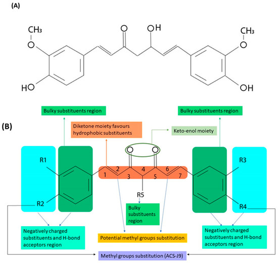(A) Chemical structure of curcumin. (B) The main pharmacophores and potential substitution positions.