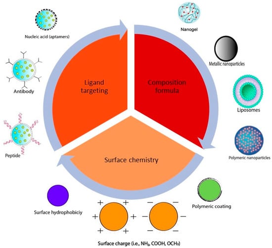 Various delivery systems for curcumin have been formulated using different nanotechnologies in order to improve curcumin properties and targetability. For the rational design of the nanoformulations, several factors should be considered in order to enhance the efficacy and improve the cellular targeting of the anticancer agents. These factors include the nanoparticle size and shape, surface properties, and nanoparticle targeting ligands [49], as illustrated in Figure 2. A summary of the most commonly used curcumin delivery systems is introduced in this section.