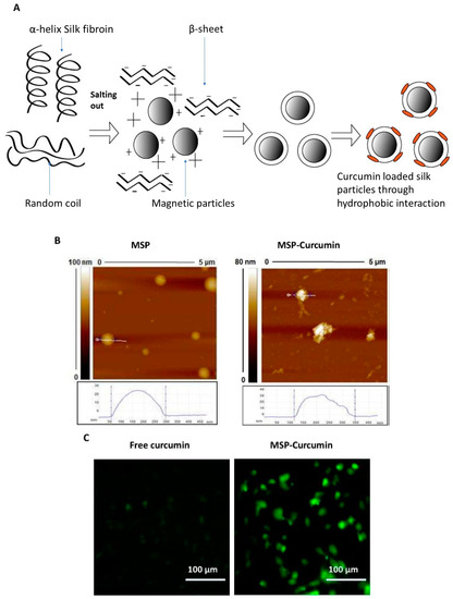 (A) Fabrication of magnetic silk particles (MSP) for curcumin delivery. (B) Atomic force microscopy (AFM) images of MSP before and after curcumin loading. (C) Representative microscopic images of MDA-MB-231 cells incubated with free curcumin and curcumin-loaded MSP showing a significant improvement of curcumin cellular uptake. Reprinted from Song et al. [54], copyright © 2017 ACS.