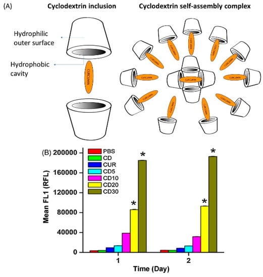 (A) Schematic structure of cyclodextrin–curcumin (CD–CUR) inclusion and self-assembled complexes (B) Fluorescence-activated cell sorting (FACS) analysis for cellular uptake of curcumin and different CD–CUR (CD5, CD10, CD20, and CD30) inclusion complexes treated in DU145 prostate cancer. * p < 0.05 represents significant difference from the curcumin uptake. Reprinted from Yallapu et al. [86] with permission from the copyright holder Elsevier.