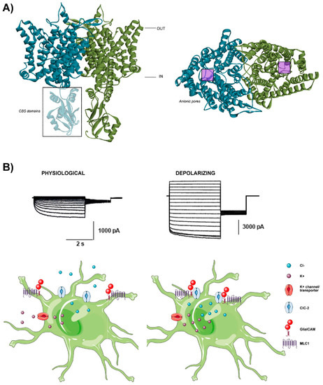 The chloride channel ClC-2. (A) The structural configuration of a CLC chloride channel. (Left) Lateral view of the dimeric form of the channel, which is comprised of two subunits distinguished by different colours. The intracellular cystathionine-β-synthase (CBS) domains are also highlighted in the unshaded box. (Right) Frontal view of the dimeric channel, where the two pores are highlighted in the purple boxes. Figures generated using the PDB model 5TQQ from human ClC-1, which has high homology to the ClC-2 channel. (B) Proposed model for depolarizing-mediated ClC-2 activation by MLC1/GlialCAM in astrocytes. In basal conditions, ClC-2 displays outwardly rectifying currents, promoting Cl− efflux (left). Upon depolarization and the consequent entrance of K+ into the cell, the MLC1/GlialCAM complex binds to ClC-2, allowing GlialCAM to modify ClC-2-mediated currents, generating a Cl− influx into the cell that may compensate the excess of K+ (right).