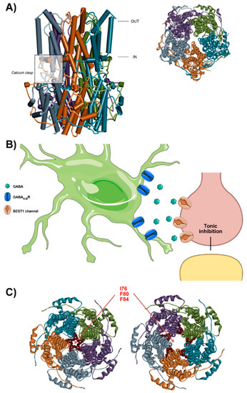Interestingly, Best1 is expressed in astrocytic microdomains near neuronal synapses. At these locations, it has been reported that Best1 can release glutamate in a slow calcium- and GPCR-dependent manner [85,87], which then targets and activates hippocampal pyramidal neurons in order to modulate synaptic plasticity [85]. Besides glutamate, Best1 is also permeable to other neurotransmitters, including GABA [85,86]. Specifically, the tonic release of GABA from glial cells (astrocytes) through Best1 channels in the cerebellum exerts tonic neuronal inhibition (Figure 2B) [84]. This inhibition is important for neuronal information processing and has been associated with several pathologies. It has been suggested that this GABAergic release from astrocytes through Best1 is important for motor coordination in the cerebellum, and may modulate neuronal inhibitory/excitatory balance [84,86].