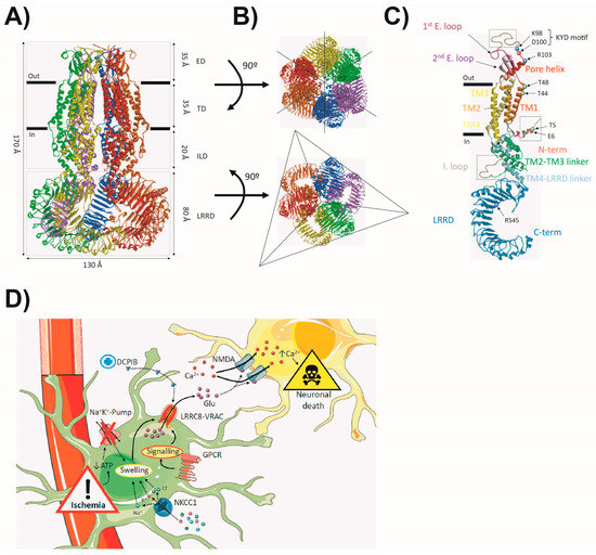 - Schober, A.L.; Wilson, C.S.; Mongin, A.A. Molecular composition and heterogeneity of the LRRC8-containing swelling-activated osmolyte channels in primary rat astrocytes. J. Physiol. 2017, 595, 6939–6951. [Google Scholar] [CrossRef] [PubMed]