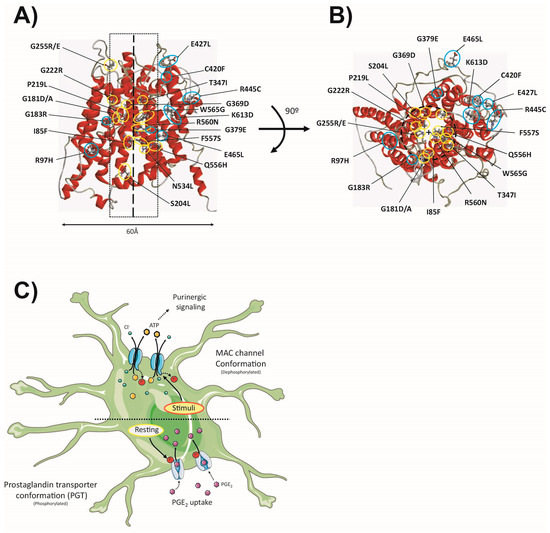 Several residues in the C-terminal side of the putative transmembrane 10 were proposed to be part of the PGE2 binding site [134]. Later studies allowed for the identification of two conserved positively charged residues (R560 (α-helix 11) and K613 (α-helix 12)) involved in substrate translocation and binding. The charge-neutralized mutant R560N was non-functional, while K613G was still functional, but exhibited a 93% reduction in transport rate [135]. Interestingly, recent studies showed that the mutants have reduced single-channel current amplitude, altered gating kinetics and voltage dependence, especially at positive voltages. Furthermore, K613G altered the selectivity of the channel by increasing cation permeability, suggesting that it could be a pore-facing residue. Surprisingly, the K613G mutation had no apparent effect on swelling-induced ATP release by the heterologous expression in HEK293T cells, showing similar values to the wild-type (WT) protein [131]. In addition, the disease mutants G222R and P219L (previously associated with pachydermoperiostosis [136,137]) were also found to be non-functional [131]. By homology modelling with the related glycerol-3-phosphate transporter, it was proposed that the R560 residue could be located in the central axis of the protein, suggesting that this location could be important for determining voltage-dependent inactivation and channel function. Consistent with this assumption, non-functional disease mutants P219 and G222 are also located close to the central axis (Figure 4A,B). However, the K613 location was farther away from the central axis (Figure 4A,B). Given the impact of the mutation on the biophysical properties of the channel, and the fact that homology modelling was based on a related transporter structure, it was hypothesized that the model could represent an “inward-open transporter conformation”. Thus, it was suggested that the SLCO2A1 protein could have two different conformations: a resting PGT transporter conformation and an activated MAC conformation (Figure 4C). According to this hypothesis, in the activated conformation the K613 residue could come closer to the central axis and contribute to the selectivity filter [131].