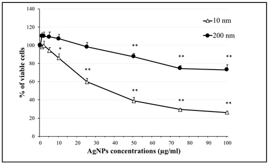 Effect of silver nanoparticles (AgNPs) (10 nm and 200 nm) on the viability of NCI-H292 cells. Viability of cells exposed to 10 nm and 200 nm AgNPs separately at concentrations of 0, 5, 10, 25, 50, 75, and 100 µg/mL. Cells were exposed to AgNPs for 24 h, then cell viability was determined using a CellTiter-Glo® luminescent cell viability assay. The results are shown as means ± SD, n ≥ 3, for each group; *0.01 < P < 0.05, ** P < 0.01. * Represents significance compared to the control group.