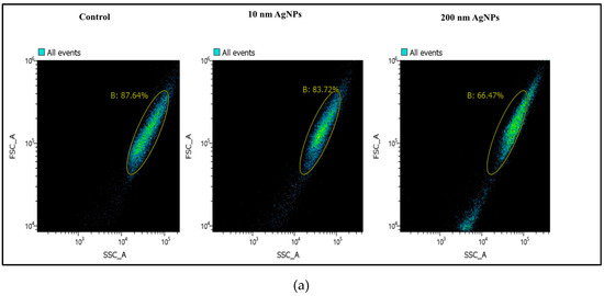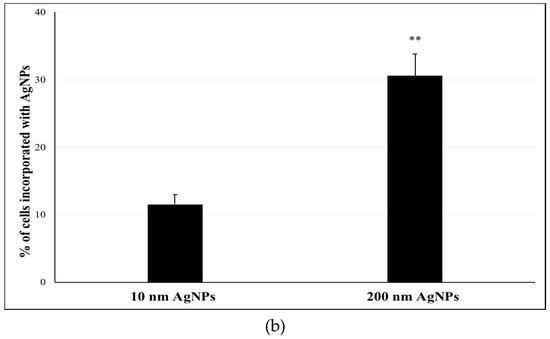 To check the percentage of cells that incorporated AgNPs, NCI-H292 cells were seeded at a concentration of 8 × 104 cells/well in a 24-well plate (Costar, Washington, DC, USA). After overnight incubation, the cells were exposed to a final concentration of 100 µg/mL of both 10 nm and 200 nm AgNPs. After 24 h of exposure, the cells were washed twice with phosphate buffered saline (PBS) and collected by trypsinization using trypsin EDTA (Wako, Japan) and centrifugation. Then, the cells were resuspended in 1 mL PBS supplemented with 6% HFBS and kept on ice until analysis.