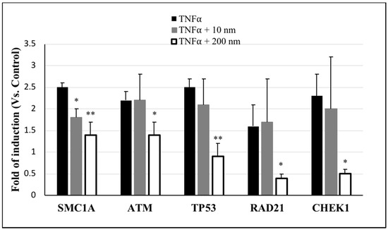 DNA damage is regulated by the DNA damage response (DDR) signaling pathway, which uses signal sensors, transducers, and effectors; the ataxia-telangiectasia mutated (ATM) and ATM- and Rad3-Related (ATR) proteins are the most upstream DDR kinases that are activated by the sensors of the DDR pathway [24]. Therefore, we used PCR array to detect the regulation of genes associated with ATM/ATR signaling as a featured pathway for DDR. Genes that were upregulated by more than 1-fold are listed in Table 1. In particular, the expressions of ATM, the CHK1 checkpoint homolog of Schizosaccharomyces pombe (CHEK1), the RAD21 homolog of S. pombe (RAD21), structural maintenance of chromosomes 1A (SMC1A), and tumor protein p53 (TP53) genes were increased by ≥ 1.9-fold in cells exposed to TNFα (20 ng/mL). Also, these same genes exhibited ≥ 1.2-fold induction in cells exposed to TNFα (20 ng/mL) + 10 nm AgNPs (100 µg/mL). However, in cells exposed to TNFα (20 ng/mL) + 200 nm AgNPs (100 µg/mL), the expression of these genes showed downregulation of ≤ 0.8-fold, indicating a reduction in TNFα-induced DNA damage by 200 nm AgNPs. To confirm the induction of the above five genes, we conducted real-time PCR analysis. As shown in Figure 5, none of the genes in cells exposed to TNFα + 10 nm AgNPs showed any significant difference in expression compared to the TNFα-exposed group, except for SMC1A, which showed a significant decrease from 2.5- to 1.8-fold induction. In contrast, for cells exposed to TNFα (20 ng/mL) + 200 nm AgNPs (100 µg/mL), all five genes showed significant downregulated expression compared to the TNFα-exposed group, especially TP53, RAD21, and CHEK1, which were downregulated from 2.5 to 0.9, 1.6 to 0.4, and 2.3 to 0.5, respectively. The mRNA expressions of these genes involved in the DDR signaling demonstrated that most of the TNFα-induced upregulated genes were downregulated by 200 nm but not 10 nm AgNPs, suggesting that 200 nm AgNPs reduced the TNFα-induced DNA damage.