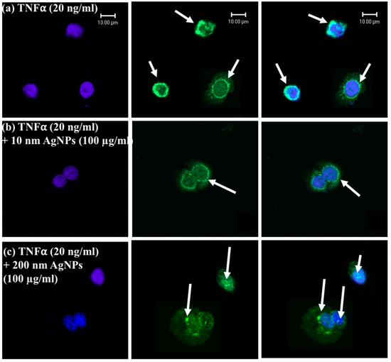 Localization of TNFR1 in NCI-H292 cells using confocal microscopy. Blue shows the nucleus, green shows the receptors (TNFR1), and blue and green together are the merged form. White arrows show TNFR1. (a) NCI-H292 cells were exposed to TNFα (20 ng/mL), and TNFR1 was distributed on the cell membrane with some aggregations. (b) NCI-H292 cells were exposed to both TNFα (20 ng/mL) + 10 nm AgNPs (100 µg/mL), and TNFR1 localization was scattered over the entire cell membrane. (c) NCI-H292 cells were exposed to both TNFα (20 ng/mL) and 200 nm AgNPs (100 µg/mL), and TNFR1 was localized inside cells with very few receptors on the cell membrane. Exposure was 24 h for all experiments. Scale bar is 10 µm for all panels.