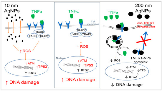 We investigated the size-dependent effect of AgNPs, and our results revealed that the expression of TNFR1 on the cell surface was reduced by 200 nm AgNPs but not by 10 nm AgNPs, suggesting a reduction in TNFα-induced DNA damage by 200 nm AgNPs.