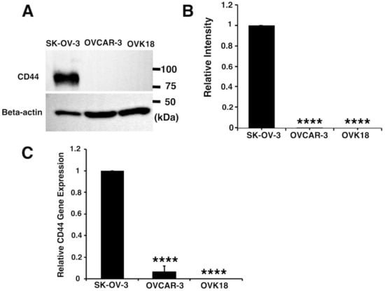 SK-OV-3 cells are overexpressing CD44. (A) Western blot analysis of human ovary cancer derived cells probed with anti-hCD44 MAb and human beta-actin antibody. (B) Relative intensity of the bands of CD44 to beta-actin in Western blot was densitometrically analyzed by ImageJ. (C) Relative gene expression levels of CD44 to glyceraldehyde-3-phosphate dehydrogenase (GAPDH) were analyzed by RT-qPCR. The data presented as the mean ± SD from three independent experiments. The statistical significance in mean values of more than two groups was determined using one-way analysis of variance (ANOVA) and Dunnet multiple comparison test using CD44 expression of SK-OV-3 cells as control; (****) p < 0.001.