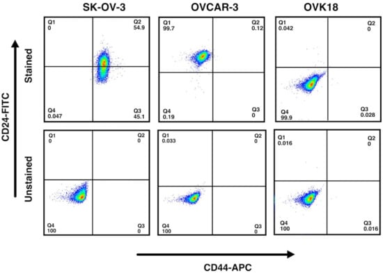 SK-OV-3 cells contain CD44+/CD24− population as well as CD44+/CD24+ population. SK-OV-3, OVCAR-3, and OVK18 cells were analyzed by flow cytometry by staining for CD44 and CD24. The margins of CD24 and CD44 for each cell line were set up by non-stained cells as the negative control shown at the bottom of each analysis. Most of the population in SK-OV-3 cells were found CD44 positive.