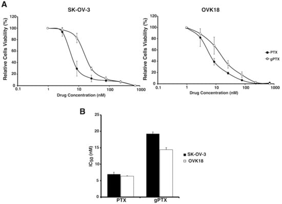 We assessed the anticancer effect of gPTX toward SK-OV-3 cells as CD44 positive cells and OVK18 cells as CD44 negative cells. In our previous report, gPTX was 3-fold weaker than PTX in breast cancer derived cells [11]. This observation was also consistent in ovarian cancer cells (Figure 3A,B). The reduced cytotoxicity should be caused by the increased of hydrophilicity of gPTX hindering penetration efficiency into the lipid bilayer of the cell membrane. However, the IC50 value of gPTX toward both cell lines is in the range of 15–20 nM, which means the cells are sensitive enough to give feasibility of using gPTX for ovarian cancer treatment. Moreover, encapsulation of gPTX into liposomes, which should confer gPTX with penetrability into the cytoplasm, and the specific ligand grafted on the liposome surface could help enhance the targeting potential minimizing systemic toxicity.