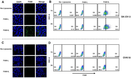 To assess the potential uptake of the liposomes conjugated to the anti-hCD44 MAb, we first prepared encapsulated 6-carboxyflourescent (FAM) into liposomes (FAM-L), which was conjugated with anti-hCD44 MAb (FAM-IL). The targeting potential of FAM-IL toward CD44 overexpressing cells, SK-OV-3 cells, was further assessed by confocal microscopic observation and flow cytometric analysis. The green fluorescence intensity of FAM between FAM-L and FAM-IL was equivalent and the green fluorescence observed in the cytoplasmic area was correlated with the intracellular uptake levels of liposome. After 2 h incubation at 37 °C of FAM-L and FAM-IL in the culture of SK-OV-3 cells, the uptake of FAM was evaluated under confocal microscopy (Figure 4A). Strong green fluorescent intensity of FAM was observed in SK-OV-3 cells when exposed to FAM-IL. According to the validation by flow cytometric analysis, SK-OV-3 cells incorporated FAM-IL in 1 h and kept up to 3 h (Figure 4B). In contrast, FAM-L did not show FAM fluorescence in OVK18 cells (Figure 4C,D), which showed no expression of CD44. These results imply that immunoliposomes targeting CD44 could effectively enhance the cellular uptake as compared with non-targeted liposomes.