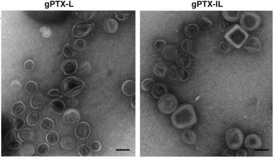 Transmission electron microscopy (TEM) images of liposome encapsulating gPTX. gPTX-IL showed unilamellar vesicles with diameter of approximately 100 nm similarly to gPTX-L. Each scale bar shows 100 nm.