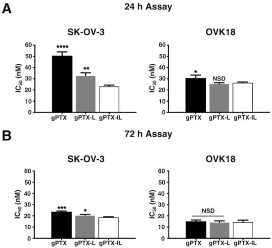 gPTX-IL exhibited the lowest inhibition concentration (IC50) in SK-OV-3 cells. In vitro cytotoxicity IC50 of gPTX in different formulation after 24 h (A) and 72 h (B) of exposure to SK-OV-3 cells and OVK18 cells was evaluated. The data presented as the mean ± SD (n = 3). The statistical significance in mean values of more than two groups was determined using one-way analysis of variance (ANOVA) and Dunnet multiple comparison test using IC50 value of gPTX-IL treatment as control, (*) p < 0.05; (**) p < 0.01; (***) p < 0.005; (****) p < 0.001; (NSD) no significant difference.