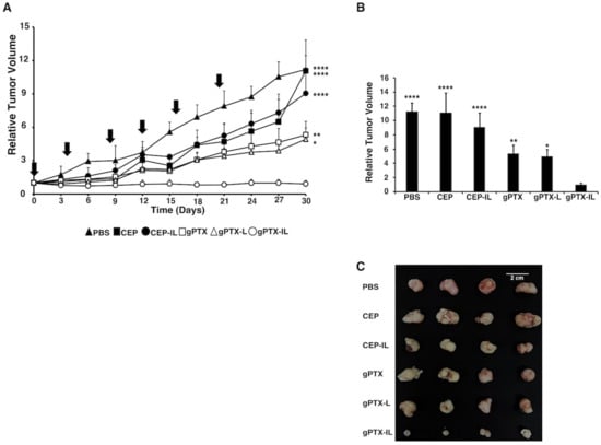 gPTX-IL suppressed tumor growth in the most effective manner in vivo. gPTX-IL (open circle), gPTX-L (open triangle), naked gPTX (open square), CEP-IL (immunoliposome of CEP solvent) (closed circle), Cremophor EL®, ethanol, and phosphate buffered saline (PBS) (CEP, closed square), or PBS (cross) was intravenously injected at day 0, 4, 8, 12, 16, and 20 (indicated by vertical arrows). (A) The effect of different formulations of gPTX on the volume of tumors. (B) Relative tumor volume at day 30. gPTX-IL was the most effective formulation to suppress the growth of tumor. The statistical significance in mean values of more than two groups was determined using one-way analysis of variance (ANOVA) and Dunnet multiple comparison test using relative tumor volume of gPTX-IL treatment as a control, (*) p < 0.05; (**) p < 0.01; (****) p < 0.001. (C) The tumors from the experiment (A) representing each group were displayed exhibiting the effect of each formulation of gPTX. Data are expressed as the mean with ± SD where n = 4.