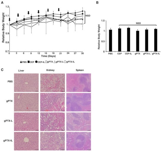 Naked gPTX, gPTX-L, and gPTX-IL were injected intravenously (i.v.) 6 times at the dose of 50 mg/kg of gPTX with 4-day intervals (Figure 7 and Figure 8). We administered PBS, CEP, and CEP-IL (immunoliposome of CEP solvent) as control. PBS used to suspend liposome was injected in equivalence to the maximum volume of injected liposome as the background. CEP as the solvent of naked gPTX was injected in equivalence to the gPTX volume. CEP-IL as the representation of immunoliposome conjugated to anti-hCD44 MAb, which encapsulates CEP alone, was injected based on the amount of lipid equivalent to that contained in gPTX-IL at dose 50 mg/kg. The tumor growth was observed for 30 days and the relative tumor volume was measured at every 3-days, then being normalized to the initial tumor volume at day 0. In our previous report, gPTX-IL conjugated to anti-HER2 MAb, was administered at 150 mg/kg as single dose injection in nude mice bearing HT-29 tumors and targeted with gPTX, it injected for 3 times in the 10 days interval [11]. This was an experiment to investigate the maximum tolerated dose to demonstrate effective high dose administration was possible. In contrast, we evaluated the effect of repeated i.v. injection of gPTX equivalent to 50 mg/kg in this study. All tumors from mice treated with five different formulations were excised at day 30 and were compared by tumor size and volume (Figure 7A–C). Loss of body weight was not observed for any of the formulations (Figure 8A,B). Moreover, pathological observations of liver, kidney, and spleen showed that gPTX-IL did not cause significant damage to the tissues during the experiment while naked drug and non-targeting liposome appeared to damage the tissues (Figure 8C). In gPTX treatment, liver showed a cytoplasmic vacuolation. Simultaneously, the kidney exhibited atrophied glomeruli and necrotic areas. In addition, spleen had enlargement of lymphoid follicles of white pulp. In gPTX-L treatment, elongated trabeculus were found in the spleen. Meanwhile, no damage was found in any of those tissues in gPTX-IL treatment. Of note, the tumor growth appeared completely suppressed solely by the administration of gPTX-IL. As a result, gPTX-IL showed excellent anti-tumor activity with fewer side effects.