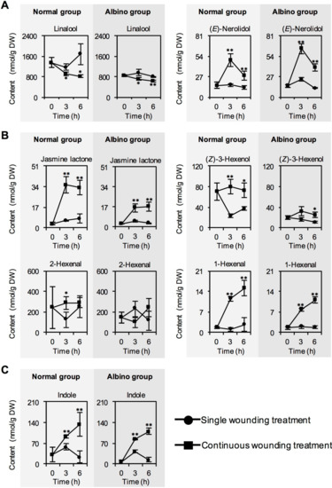 Changes in contents of characteristic aroma compound biosynthetic genes of normal tea leaves and albino tea leaves exposed to single wounding treatment and continuous wounding treatment, respectively. Data are expressed as mean ± SD (n = 3). * p ≤ 0.05; **, p ≤ 0.01, comparison between single wounding treatment and continuous wounding treatment at the same treatment time. (A) Volatile terpenes. (B) Volatile fatty acid derivatives. (C) Indole.